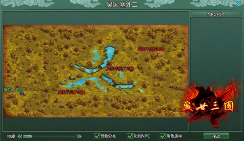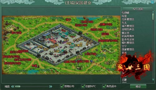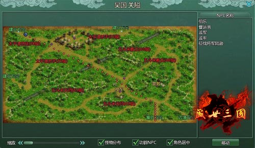 吴国的主城是吴国的政治中心,里面应有竟有。不过城外就没有城内那么安全了。吴国的城外隐藏着许多的敌人,我们可以在图中看到敌人主要分布在城外的什么地方,不同级别的敌人分布在不同的地方。玩家可通过这张图了解敌人的聚集点,以免吃亏。