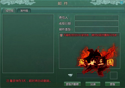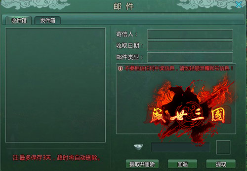 写信对于现在的高科技来说已经是很古老的事情了。现在我们都习惯了用邮箱写信,因为它又快又准时。没事的时候,可以利用邮箱多和自己的好朋友们沟通沟通。8090盛世三国的邮箱也是可以用来写信给朋友、战友沟通的。玩家们可以通过邮箱跟其他的玩家们一起了解游戏的攻略、交朋友等等。玩家们发邮件给别人需要付一点银子,只有这样邮件才可以发出去,并且邮件最多只能保存三天,超时的话将会自动删除。为了不浪费别人的一份心意和银子,玩家可要经常查看自己的邮箱哦!