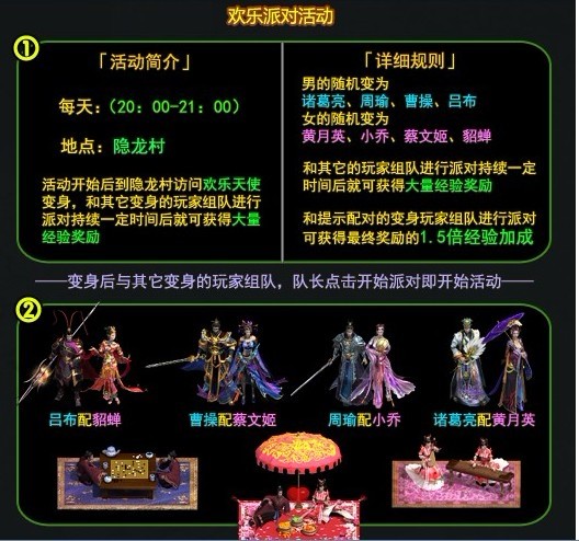 完成方式二:变身后,跟任意武将或美女二人派对,二人派对时间结束后,活动完成获得大量经验