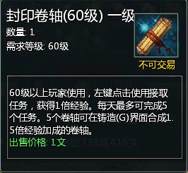 封印卷轴可以在日常任务或日常副本中的过关斩将及叛军营地任务中获得。直接从包裹中点击使用接取随机任务,将获得一倍经验。每天最多可以完成5个任务,5个卷轴可以合成一个1.5倍经验加成的卷轴。