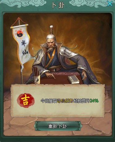 卜卦,之所以排第一位,是因为这不费一分一毫一丝力气就能直接获得经验加成。卜卦功能是要玩盛世三国新推出来的系统。每天进入游戏后,第一件事就是进行卜卦。卜卦所显示的结果一般都是吉或者平,都会有一定的加成,只是任务和加成百分比有所变化级,只要完成卜卦所显示的任务,便能获得相应的加成。