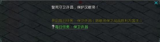 发布后,任务怪会刷新在许昌南门外(346,372)完成后获得海量经验(献帝保卫战胜利国为1.5倍)和高级星石(随机3-7个)的奖励。