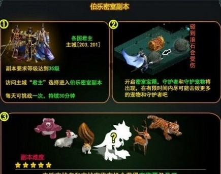 在伯乐密室中玩家避开滚石可以打开宝箱,宝箱中会有黄色甚至绿色的BOSS出现,杀掉BOSS就能获得宠物蛋、装备及坐骑时装。一般BOSS中战虎、白虎都是爆坐骑时装的,只有松鼠、咪咪猫等可以爆出宠物来,爆出的宠物有雪橇犬、咪咪猫、棕熊、霸王龙、虎崽、梅花鹿、雪雕、松鼠等。