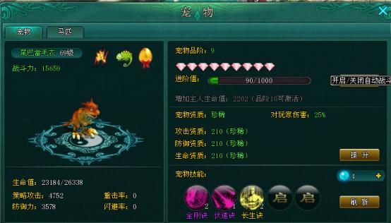 技能品质高低依然是 白色-蓝色-黄色-绿色-紫色。品质越高加成也就越高!宠物的提升和进阶想必不用多说了!