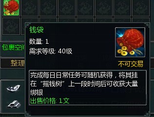 摇钱树能助大家致富,但天上是不会白白掉馅饼的,随意想使用摇钱树的同学必须把每日日常任务做完,做完每日日常任务后可以获得随机物品【钱袋】。