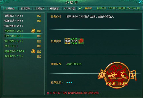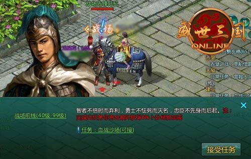 说起战场上最勇猛无敌的当然是那一个个冲锋在前、杀敌当先的战士们,他们气魄惊人,力量威猛,当真是一夫当关万夫莫开!还记得三国时期的赵子龙和关云长吗?关云长千里走单骑,赵子龙曹军大帐杀个七进七出,吕奉先虎牢关前力战三英等等,都是何等的气魄胆识!在8090盛世三国里,也有着这么一个任务让玩家们尝试单骑杀敌的快感,享受战士的最高荣誉! 在三国时期论武功首推何人?这的确是一个很难说的问题,可能很多朋友马上会想到马中赤兔,人中吕布,但玩家可曾想到在8090盛世三国里的武功之首就是你们,拥有万夫不当之勇,入千军万马如无人之境!在8090盛世三国各大主城里,玩家们可找到NPC战场先锋陆抗接受“血 ![]() 代表国家的勇士们在战场线上与敌人激战,玩家们当然不可错过机会尽显身手大展拳脚,接到任务后就马上赶往战场吧!那里有着很多的敌人等着你们去歼灭!8090盛世三国“血战沙场”任务在每天晚上18:30开启,23:30分结束,玩家们可在这时间段内完成陆抗将军交给你们的任务。 ![]()