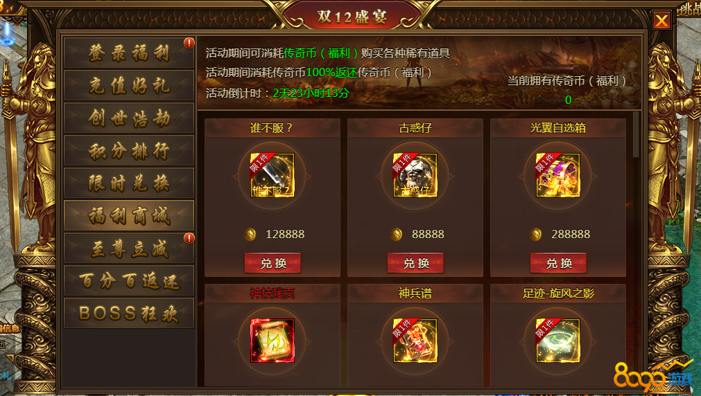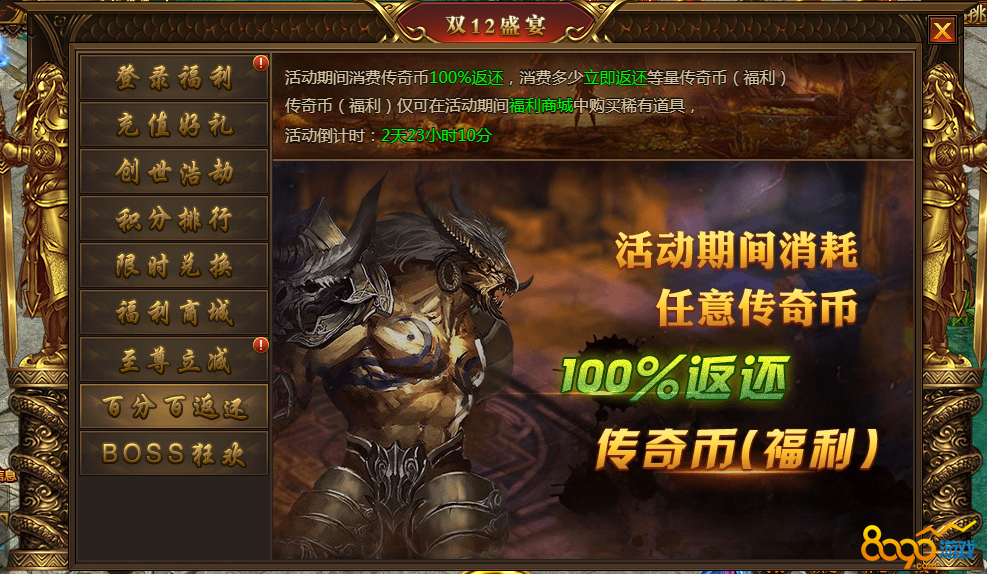1.活动期间消费传奇币即可返还等量福利传奇币,福利传奇币可在福利商城购买商品,活动结束后福利传奇币不清空