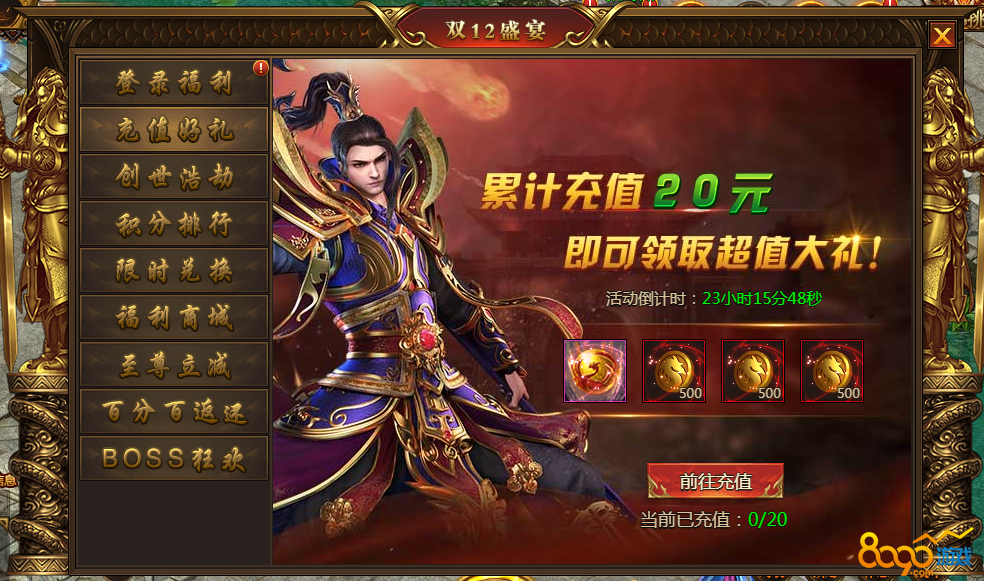 1.活动期间,玩家每日充值20、200、500元,均可领取超值大礼;