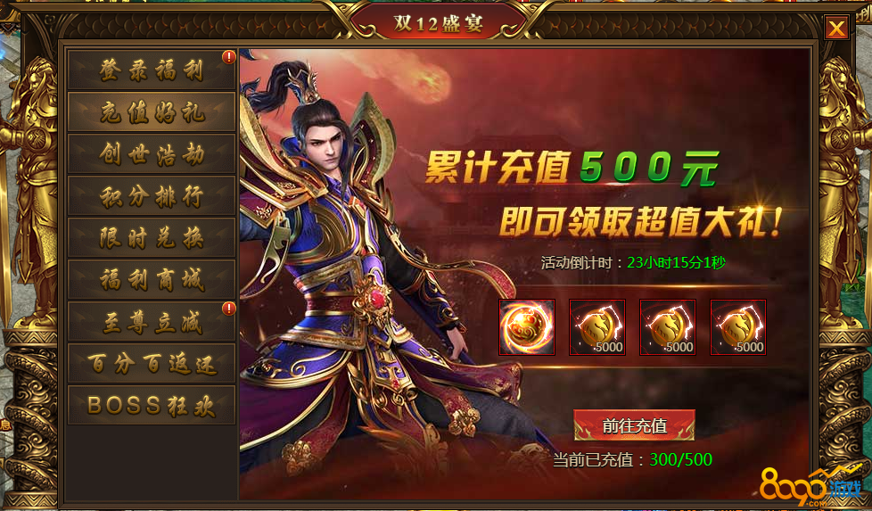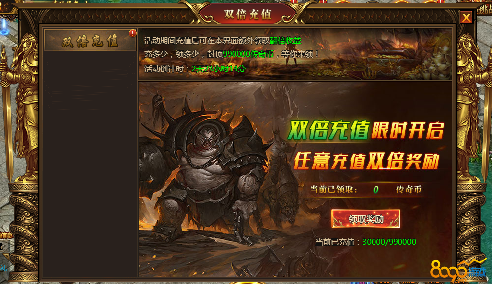 1.活动期间充值后可在双倍充值页面领取与充值金额等量的传奇币,封顶990000传奇币(9900元)