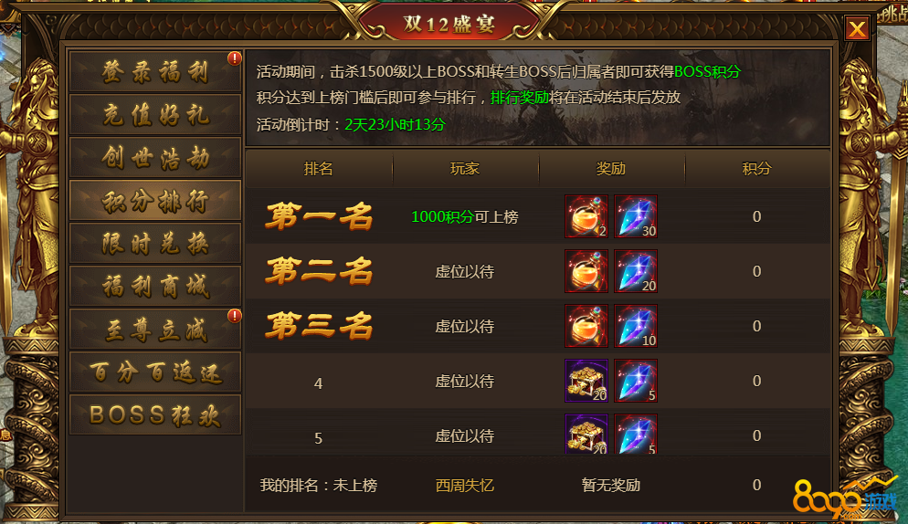 1.活动期间击杀1500级以上的BOSS和转生BOSS即可获得BOSS积分,活动结束后按积分排名发放奖励