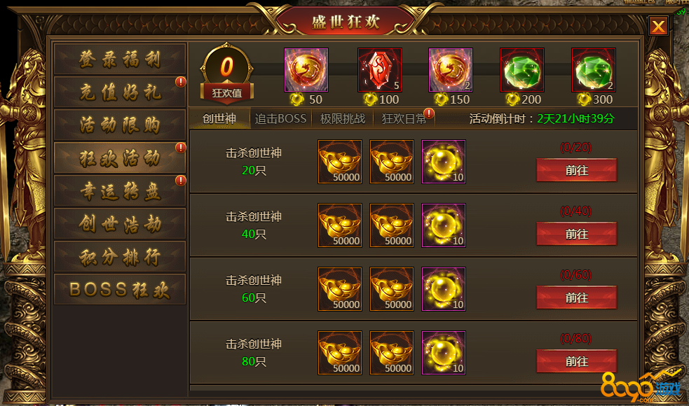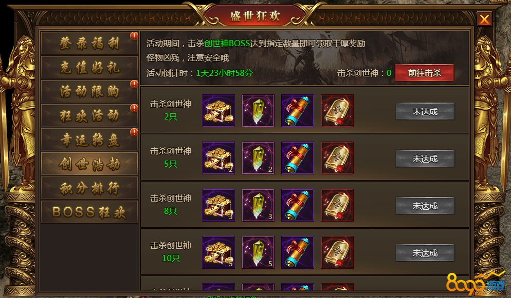 活动内容:活动期间击杀创世神BOSS达到指定数量即可领取奖励
