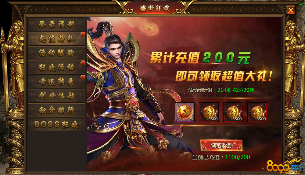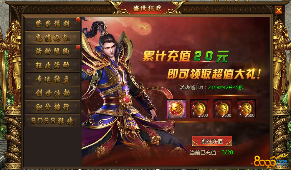 1. 活动期间,玩家每日充值20、200、500元,均可领取超值大礼;