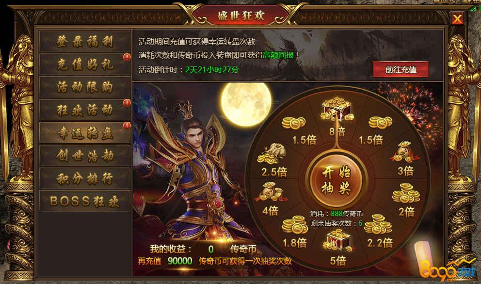 活动内容:活动期间充值可获得转盘次数奖励,消耗转盘次数和传奇币转动转盘可转取倍数,获得消耗传奇币*转取倍数的传奇币奖励