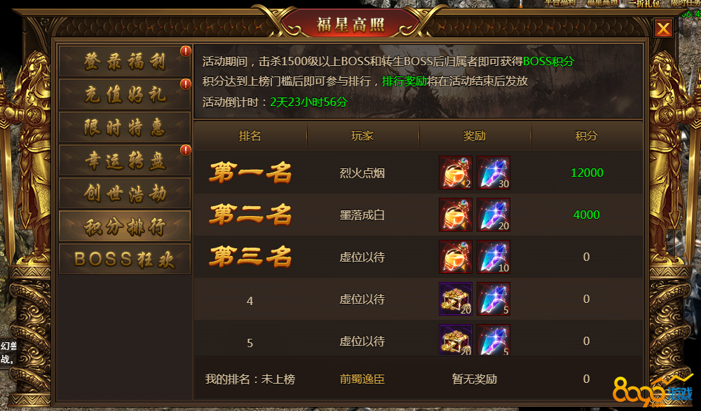 活动内容:活动期间击杀1500级以上的boss和转生boss获得积分,活动结束后更加排行邮件发送奖励