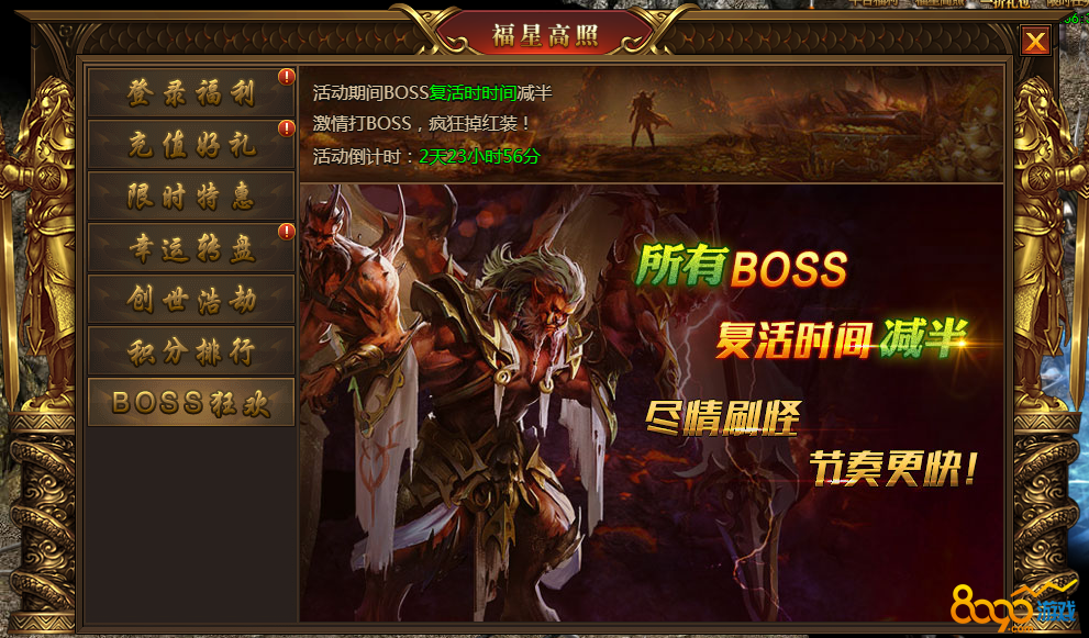活动内容:活动期间BOSS复活时间减半(跨服BOSS除外)