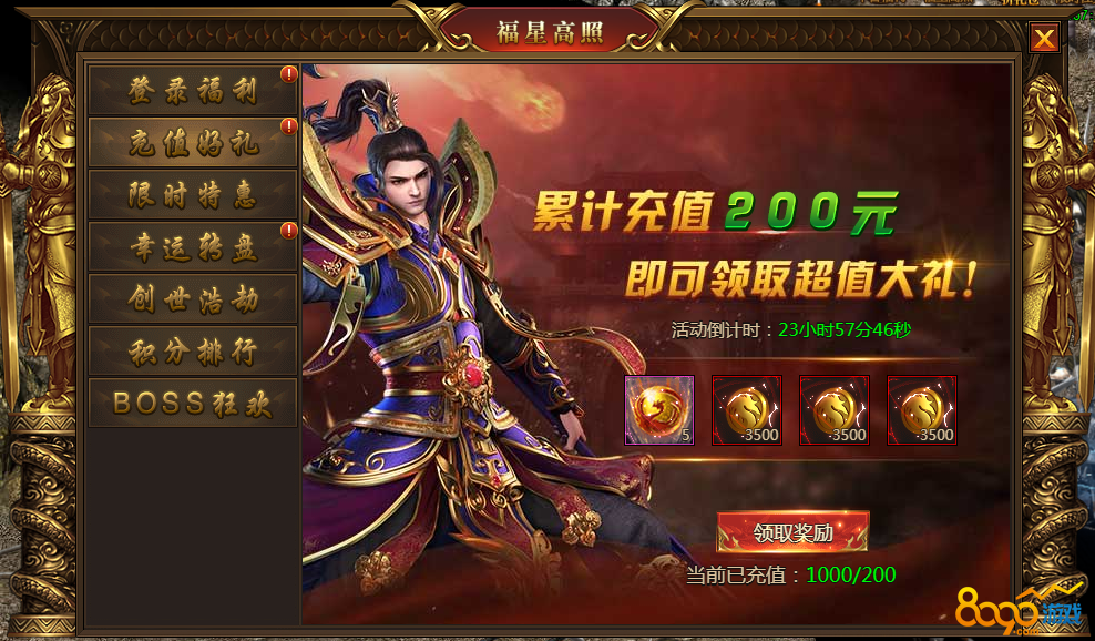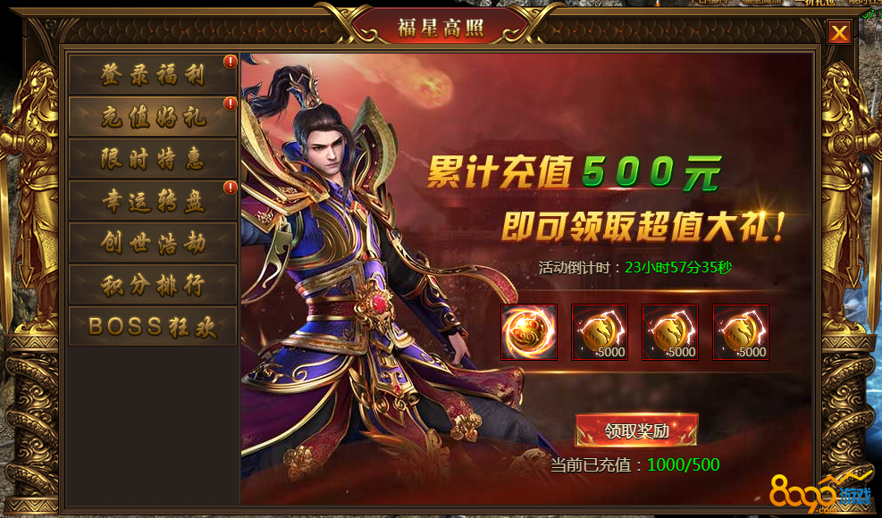 活动内容:活动期间充值可获得幸运转盘次数,消耗转盘次数和传奇币投入转盘可获得高额回报