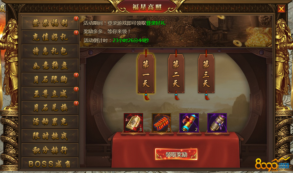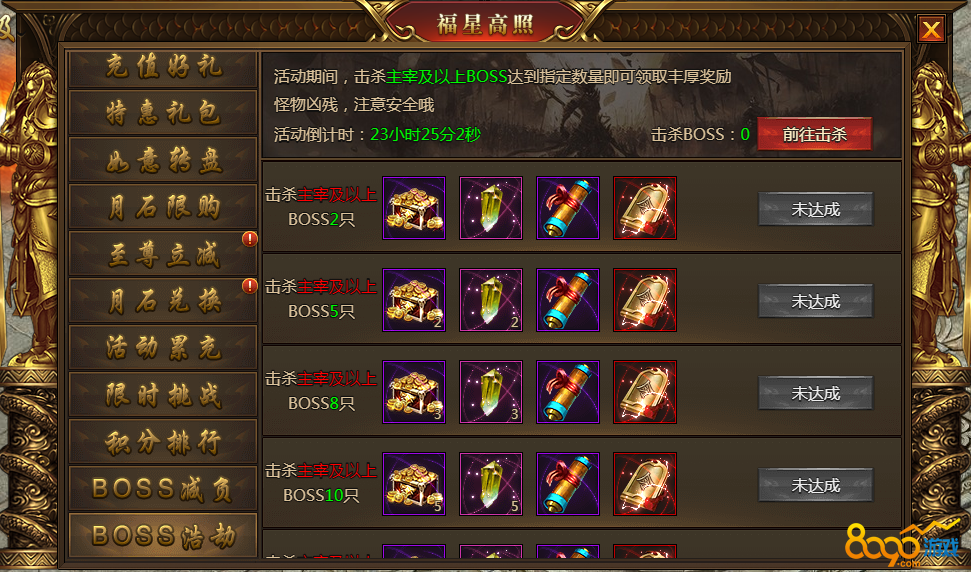 1.活动期间击杀指定数量的主宰及以上BOSS即可获得奖励