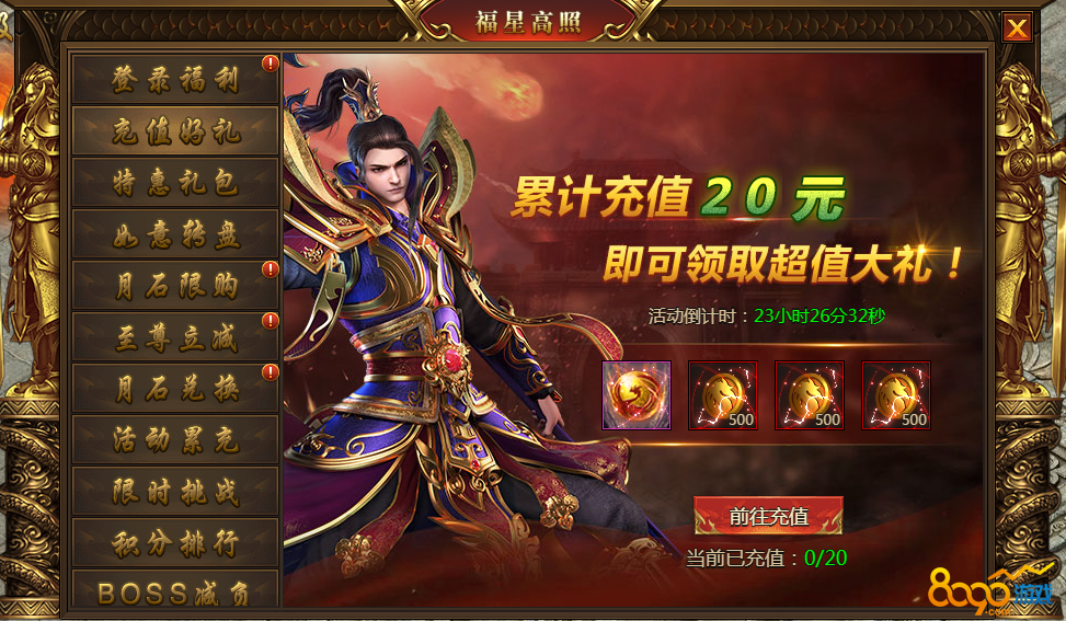 1.活动期间,玩家每日充值20、200、500元,均可领取超值大礼;