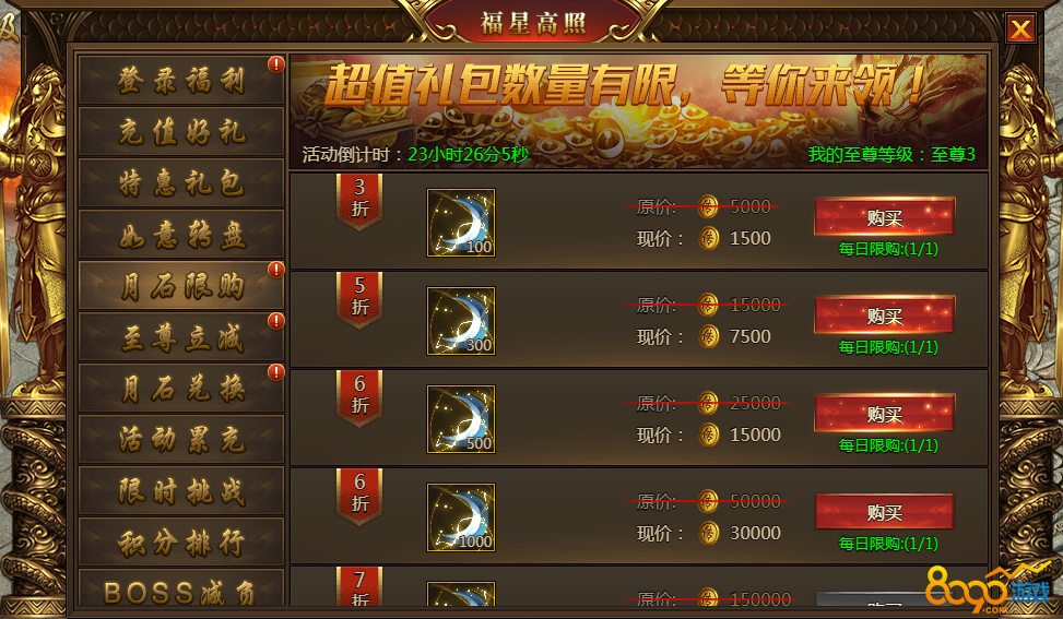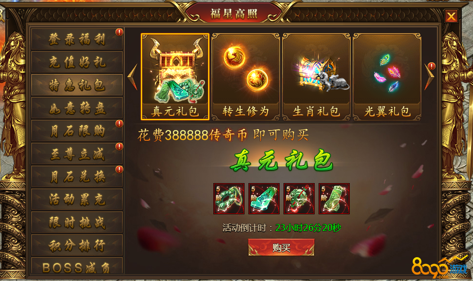 活动内容:活动期间消耗传奇币即可购买特惠礼包