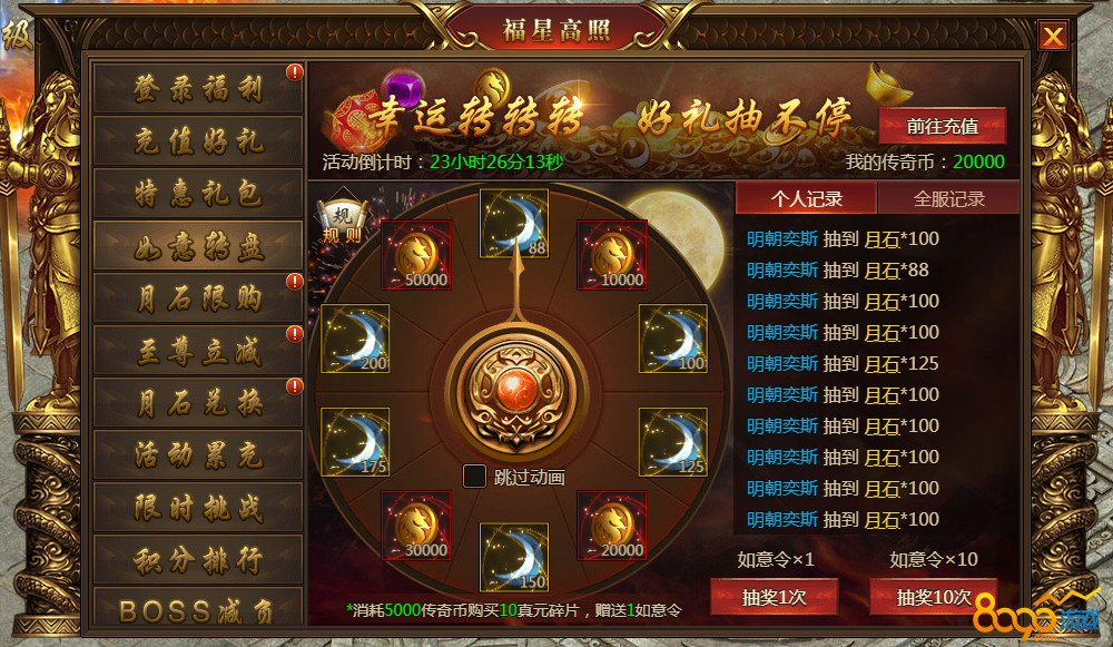 活动内容:活动期间可以消耗如意令进行转盘抽奖,寻得传奇币及月石,月石可用于兑换稀有装备、绝版时装以及珍贵道具