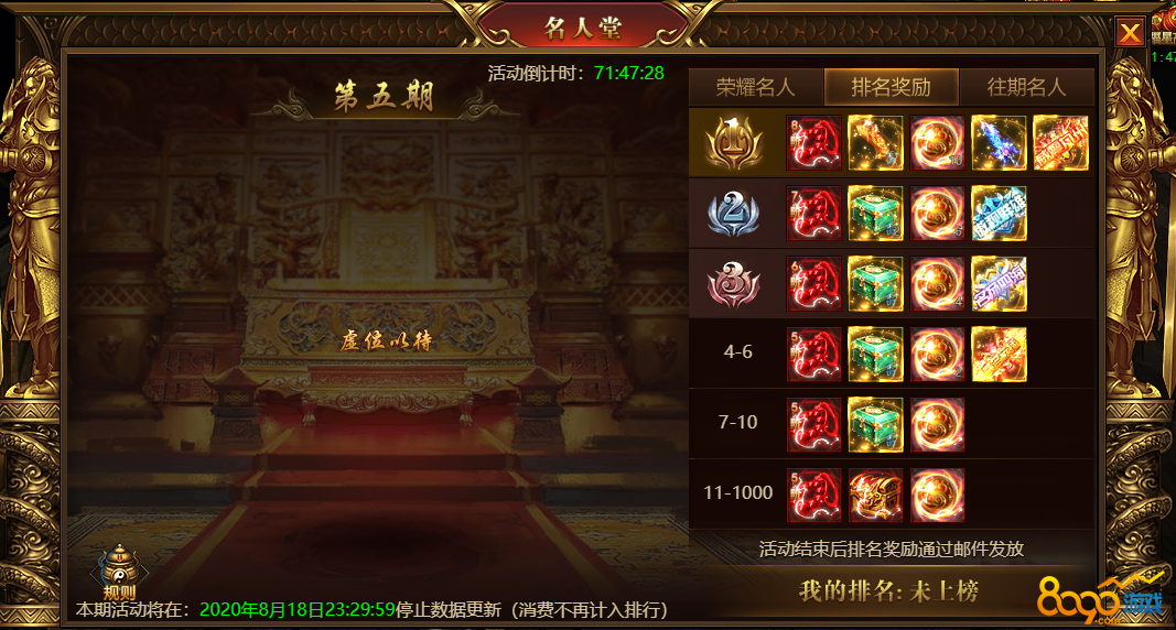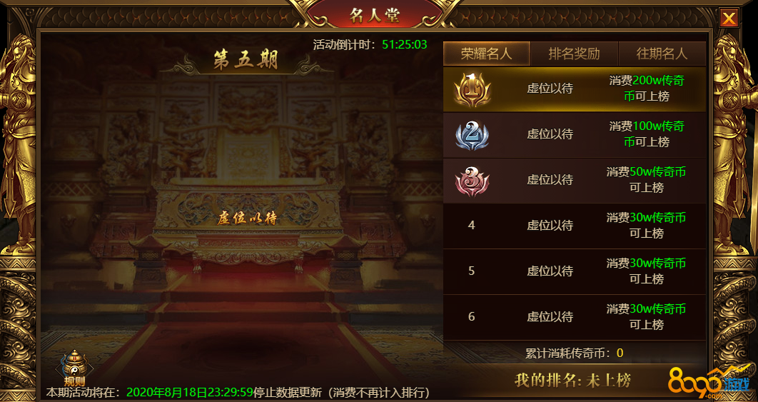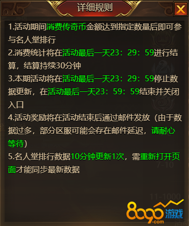 1.活动期间充值消费传奇币金额达到指定数量后可参与名人堂排行,玩家消费统计将会在活动结束前半小时进行结算,结算持续30分钟,期间不会继续记录玩家的消费数据,名人堂排行奖励将会在活动结束后通过邮件统一发放