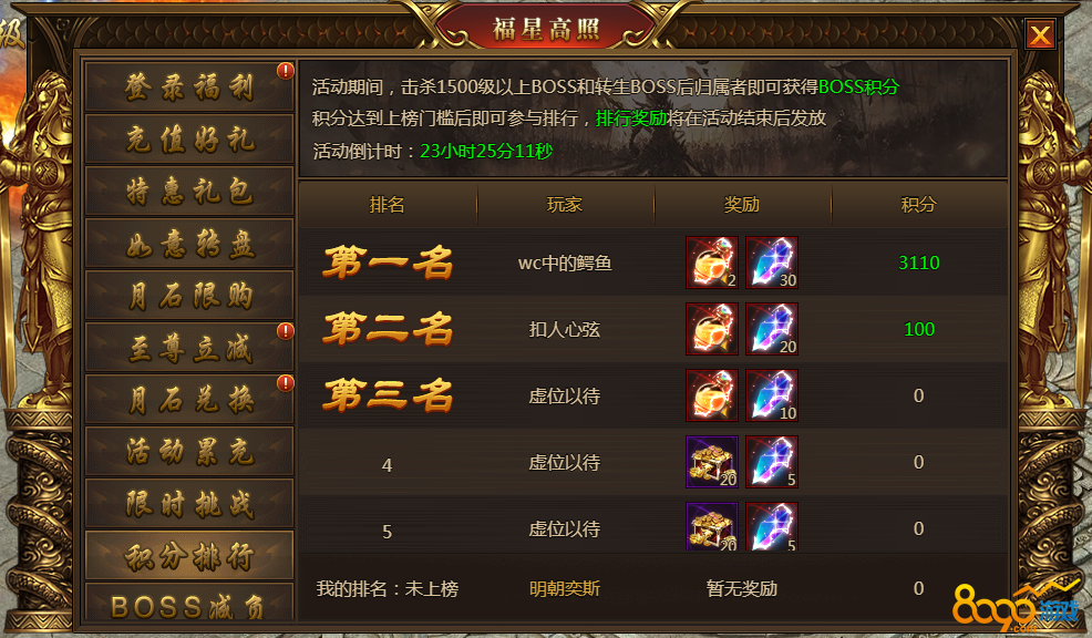 1.活动期间击杀1500级以上的boss和转生boss获得积分,活动结束后更加排行邮件发送奖励