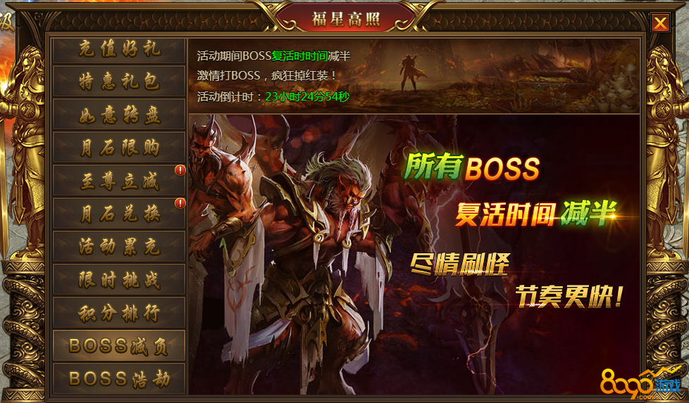 1.活动期间所有boss复活时间减半(跨服boss除外)