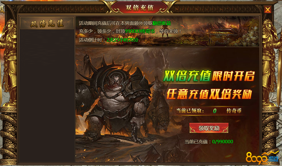 活动内容:活动期间充值后可在双倍充值页面额外领取一份充值等额的传奇币奖励