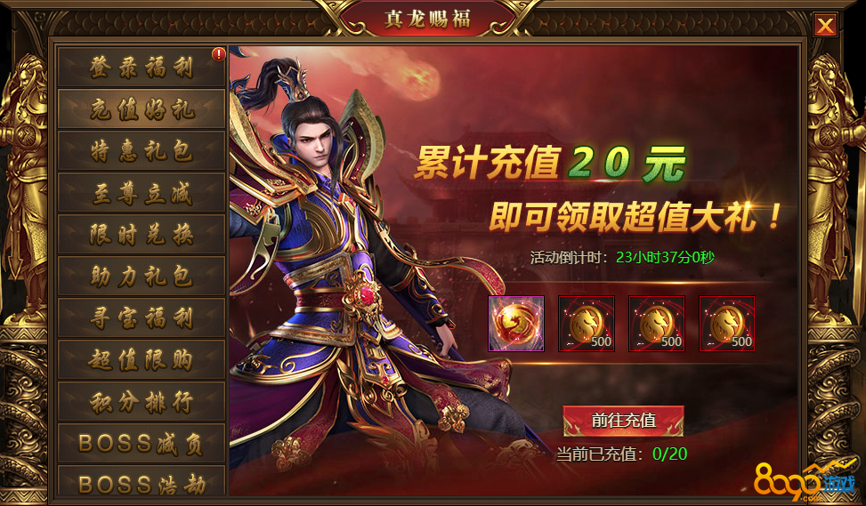 1.活动期间,玩家每日充值20、200、500元、1000元,均可领取超值大礼;