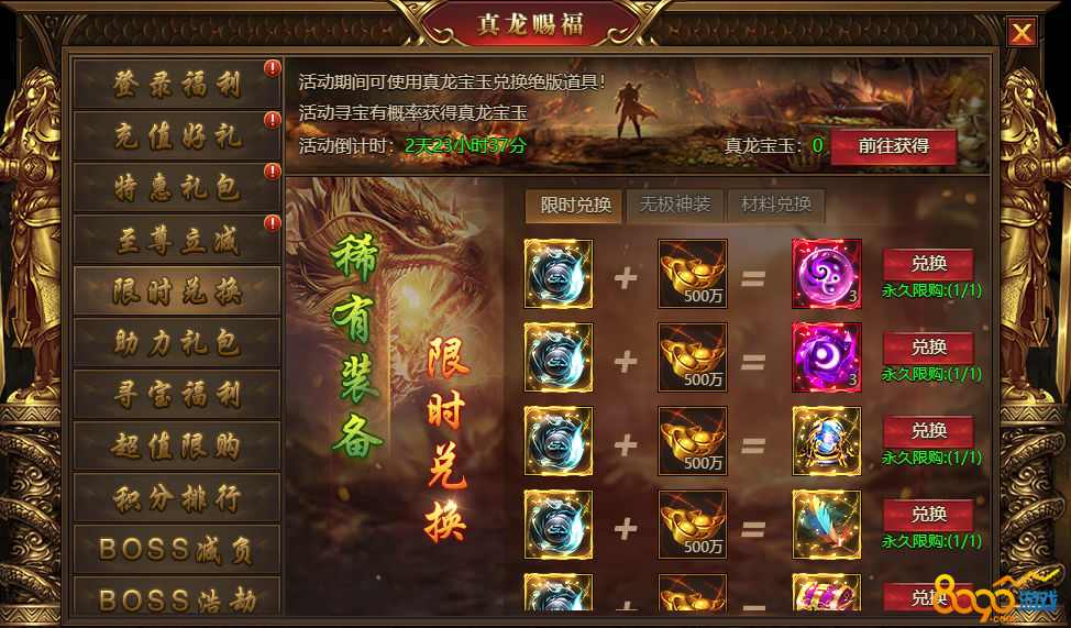 活动内容:活动期间可使用真龙宝玉兑换绝版道具