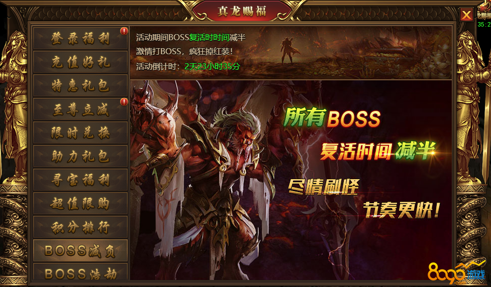 1.活动期间所有boss复活时间减半(跨服boss除外)