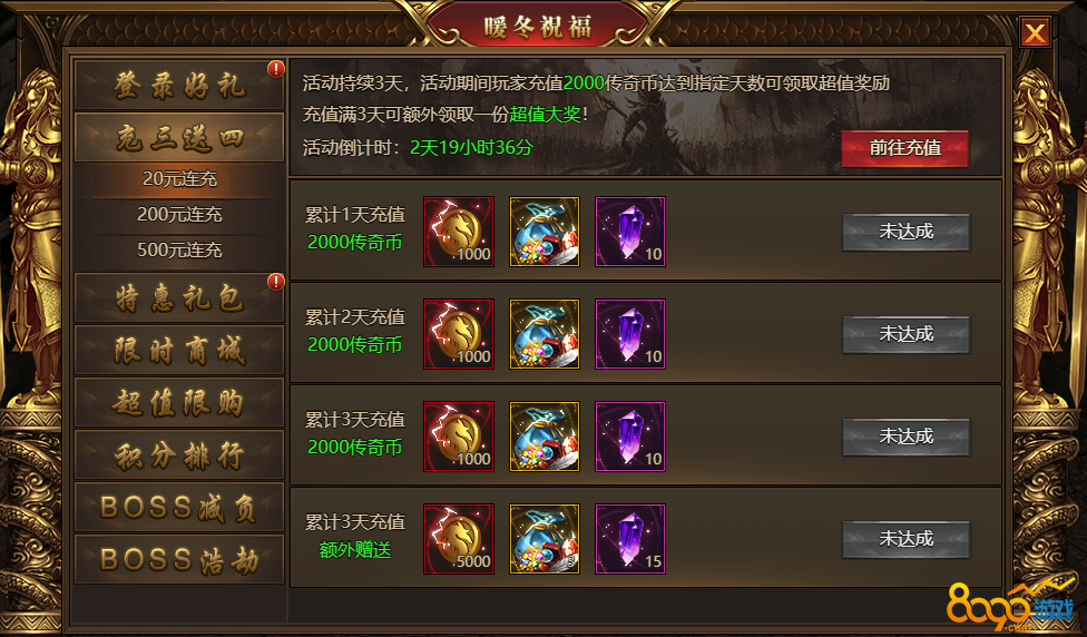 1.活动期间,玩家每日充值20、200、500元,累计充值3天,额外赠送一份超值大礼