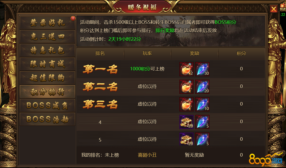 1.活动期间击杀1500级以上的boss和转生boss获得积分,活动结束后更加排行邮件发送奖励