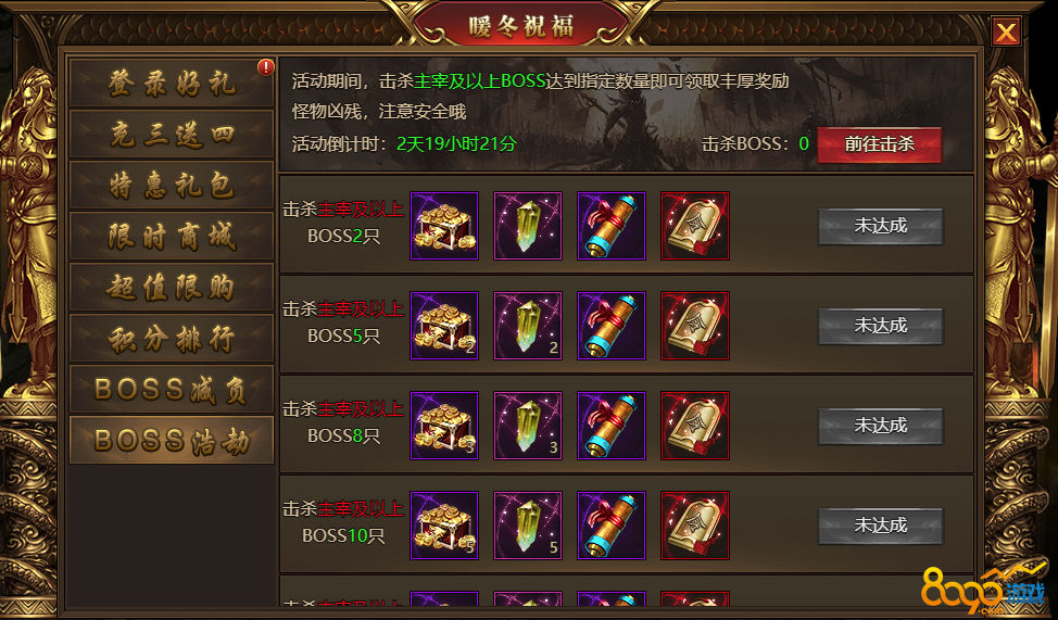 1.活动期间击杀指定数量的主宰及以上BOSS即可获得奖励