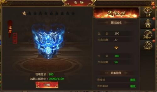 100级可激活,可增加角色生命和生命回复,升级需要消耗尘盾精华,主要通过竞技场获得。