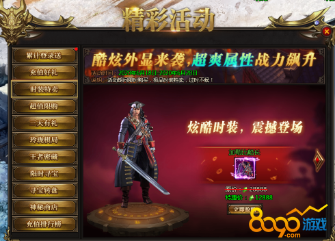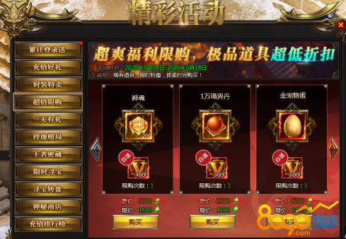 活动说明:各种稀有道具限时购买,同时送大量神王币