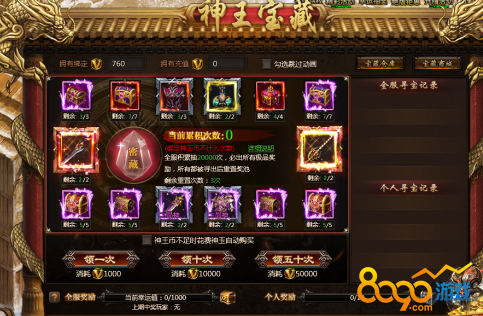 活动说明:神王宝藏限时发放极品装备、神器等,全服寻宝达到一定次数可获得保底奖励