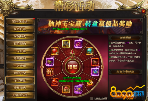 活动说明:每抽取250次神王宝藏可获得转盘机会,转动转盘获得极品保底奖励