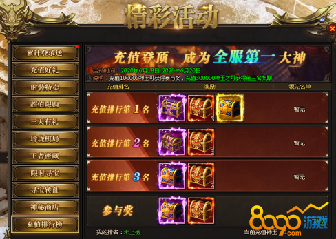 活动说明:名动本服,充值达到300000神玉即可参与排行,前三名均可获得极品自选宝箱。充值达到100000神玉即可获得参与奖。奖励会在活动结束后通过邮件发放