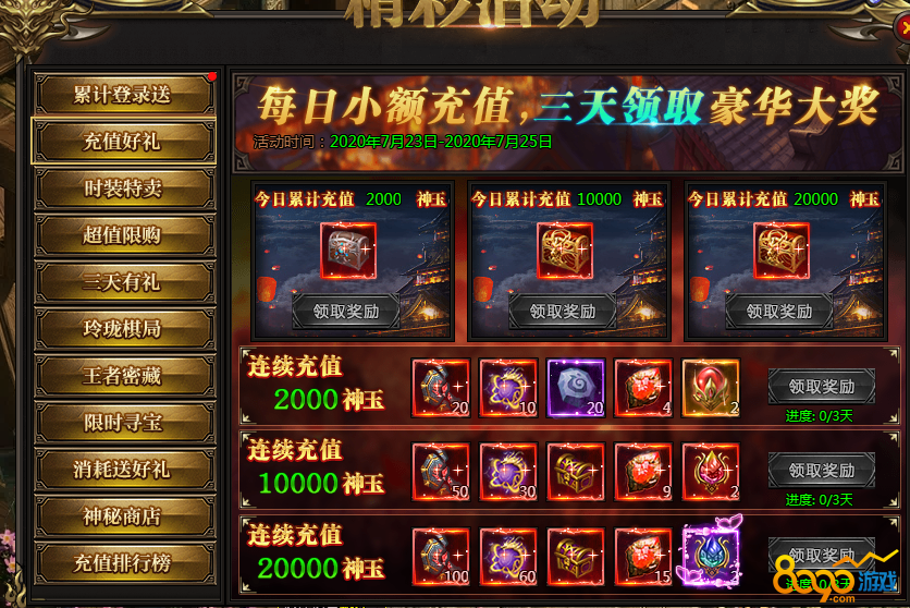 活动说:每日充值可以领取充值宝箱,连续三天充值更有额外极品奖励