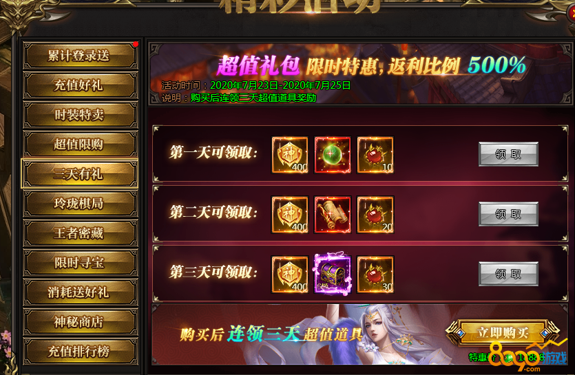活动说明:一次购买,未来三天每日皆可领取极品奖励,助力成神