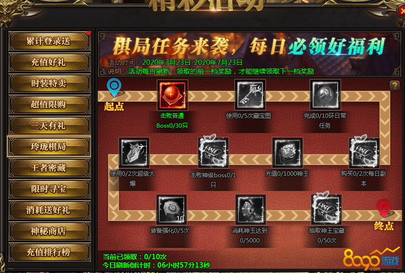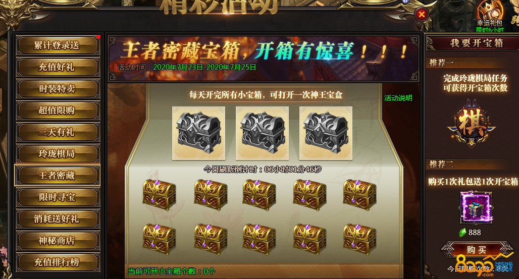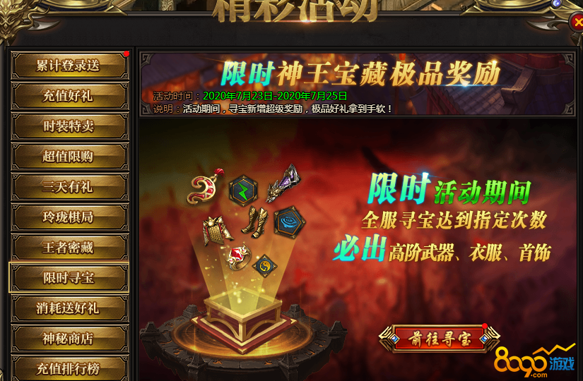 活动说明:神王宝藏限时发放极品装备、神器等,全服寻宝达到一定次数可获得保底奖励