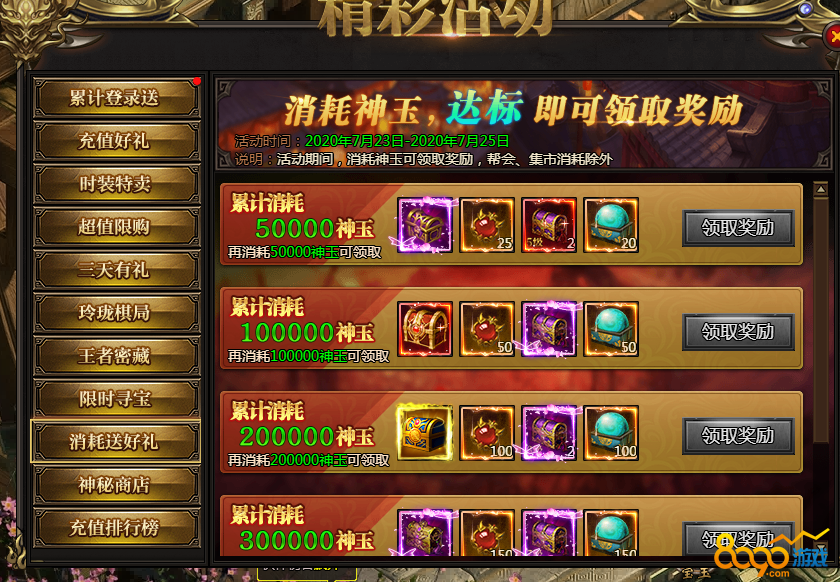 活动说明:活动期间,消耗神玉可以领取奖励,帮会、集市消耗除外