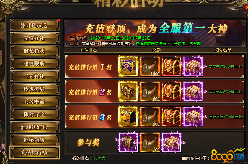 活动说明:名动本服,充值达到100000神玉即可参与排行,前三名均可获得极品自选宝箱。充值达到50000神玉即可获得参与奖。奖励会在活动结束后通过邮件发放
