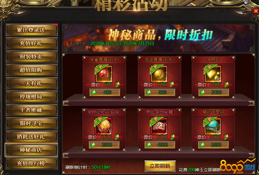 活动说明:神秘商店限时来袭,超低折扣,限时购买。同时可以通过刷新按钮,花费200神玉进行刷新