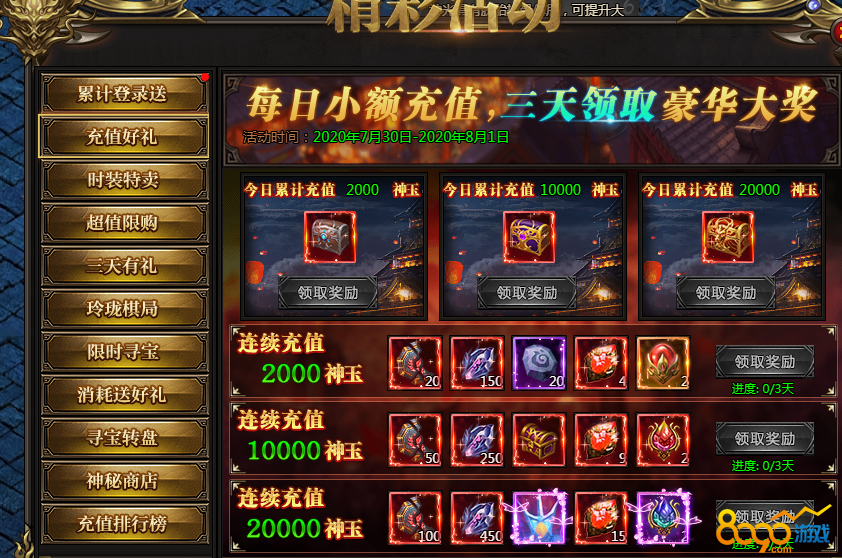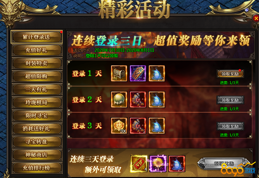 活动说:每日充值可以领取充值宝箱,连续三天充值更有额外极品奖励