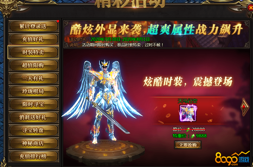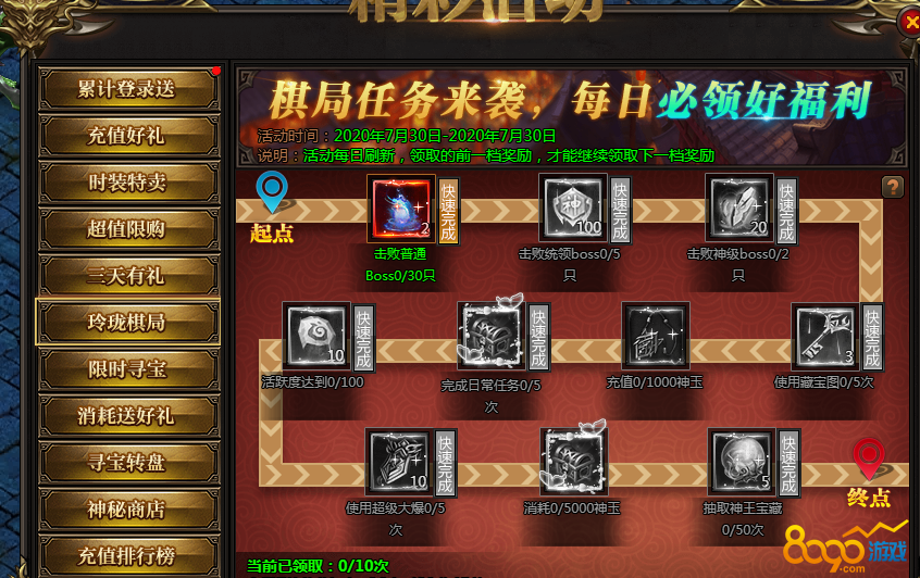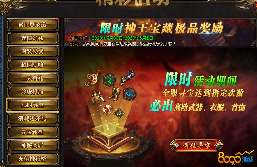 活动说明:神王宝藏限时发放极品装备、神器等,全服寻宝达到一定次数可获得保底奖励