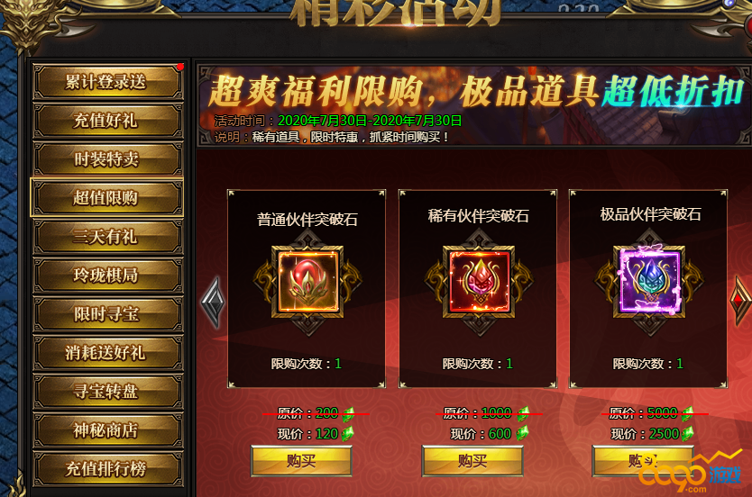 活动说明:一次购买,未来三天每日皆可领取极品奖励,助力成神