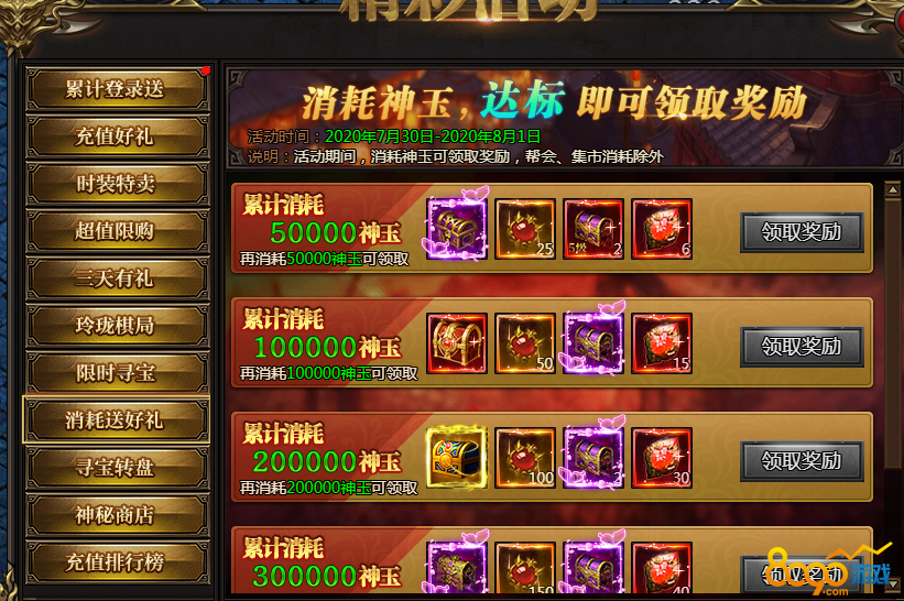 活动说明:活动期间,消耗神玉可以领取奖励,帮会、集市消耗除外