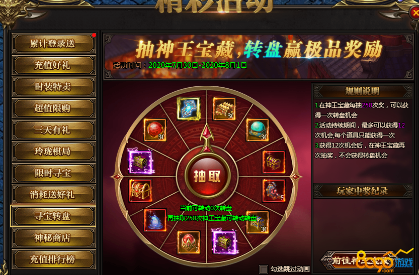 活动说明:每抽取250次神王宝藏可获得转盘机会,转动转盘获得极品保底奖励
